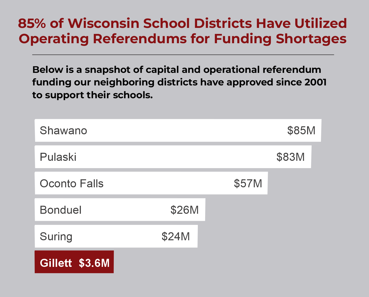 Due to state-funding not keeping pace with inflation, school districts across Wisconsin continue to seek authorization from their communities to exceed state-imposed revenue limits to address funding shortages.  As a result of successful operational referendums in our area, Gillett School District has the lowest tax levy when compared to neighboring districts.
